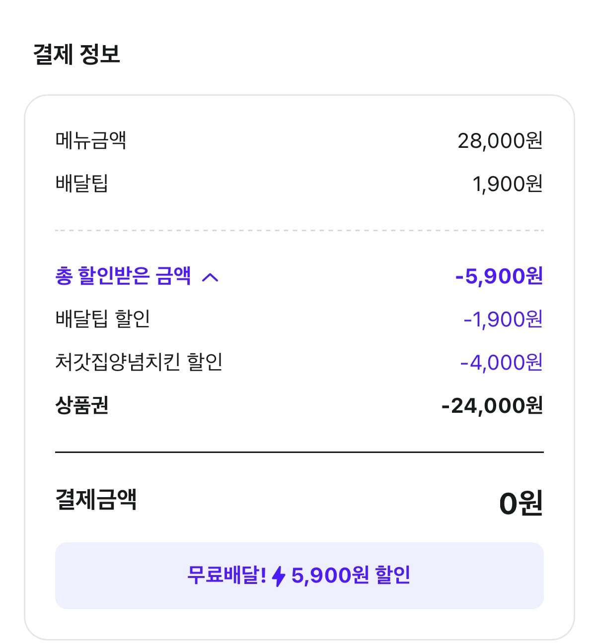 엇 그런데 막상 저녁에 처갓집 시키려고 보니 겨우 4,000원밖에 할인되지 않았습니다. 최소 주문 금액 미달인가...보아도 제품 가격만 28,000원이라 그럴 수는 없었습니다.